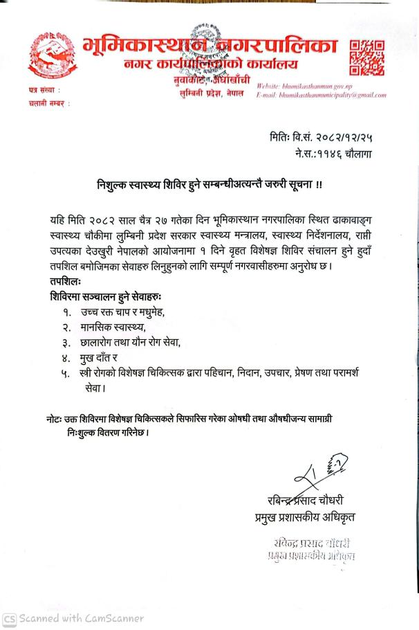 निःशुल्क स्वास्थ्य शिविर सञ्चालन हुने सम्बन्धी सूचना।