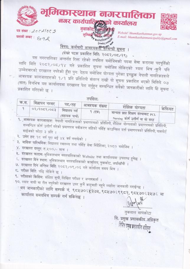 कर्मचारी(विद्यालय नर्स) आवश्यकता सम्बन्धि सूचना।