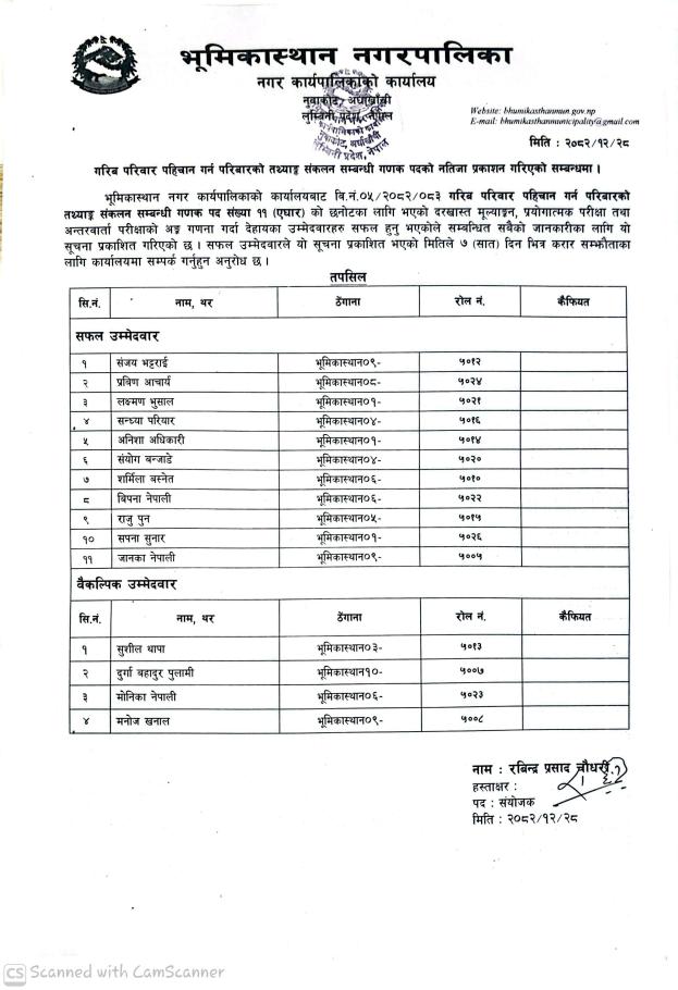 गरिब परिवार पहिचान गर्न परिबारको तथ्याङ्ग संकलन सम्बन्धी गणक पदको नतिजा प्रकाशन गरिएको सम्बन्धमा ।