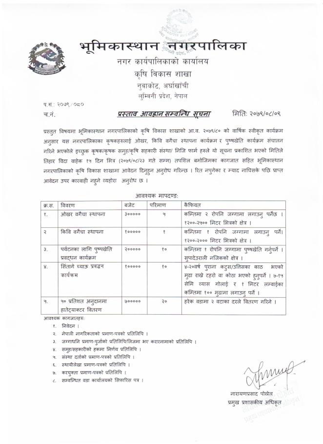 » प्रस्ताव आह्वान सम्बन्धी सूचना २०७९.०८.०९ (औखर/किवी बगैंचा स्थापना‚ पुष्प खेती‚ सिताके च्याउ र हाते ट्रयाक्टर)