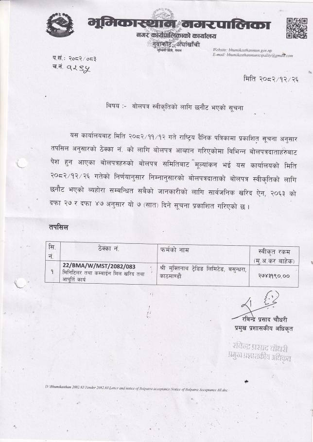 बोलपत्र स्विकृत लागि छनौट भएको सूचना ।