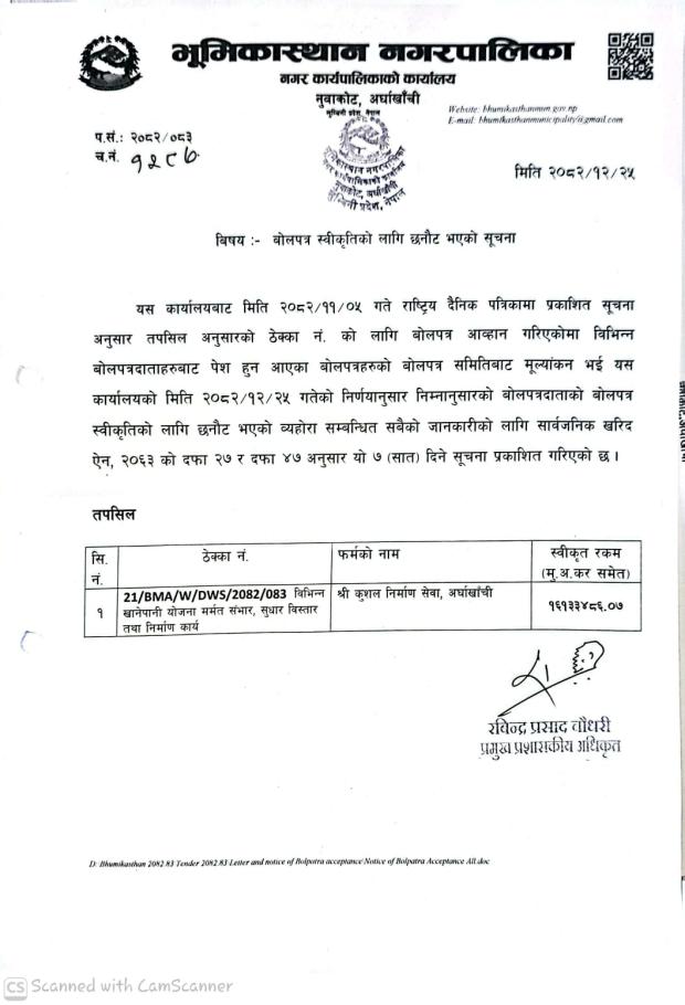 बाेलपत्र स्वीकृतीका लागि छनाेट भएकाे सूचना २०७७.१२.०८