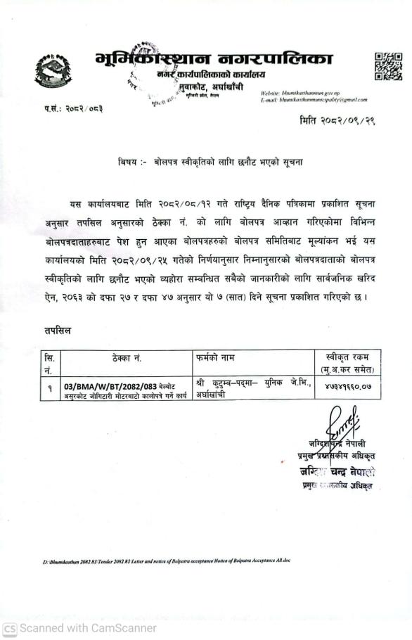 बाेलपत्र स्वीकृतीका लागि छनाेट भएकाे सूचना २०७७.१२.०८