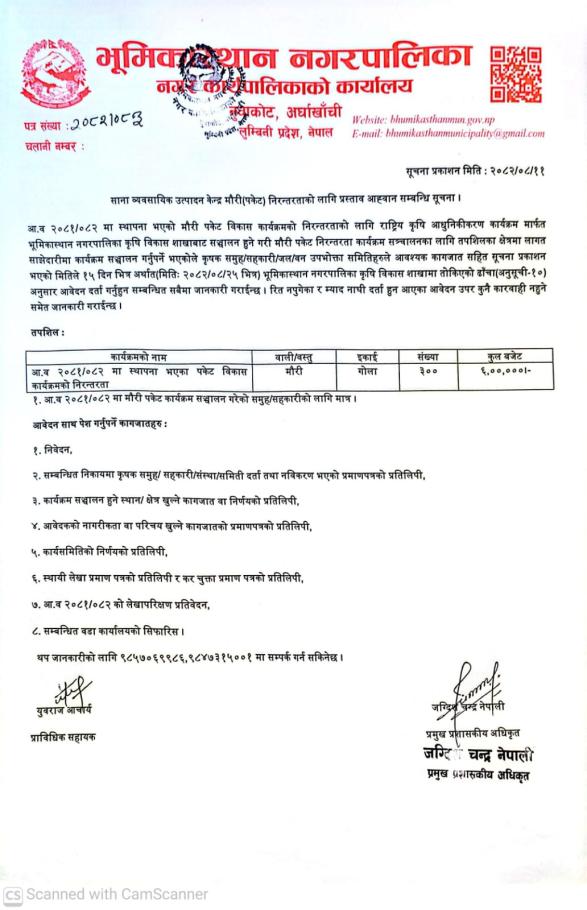 साना व्यवसायिक उत्पादन केन्द्र मौरी (पकेट) निरन्तरताको लागि प्रस्ताव आह्वान सम्बन्धी सूचना ।